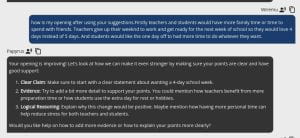 Kia Ora we have been learning how to make an argument. For example one side says For and Against the argument is why should school be 4 days a week instead of 5. I was doing for so I had to write about why I think school should be 4 days a week for an example I think school should be 4 days a week because teachers and students would have less stress at school because they would have more time at home to finish their work and still have time to hang out with your friends or family.