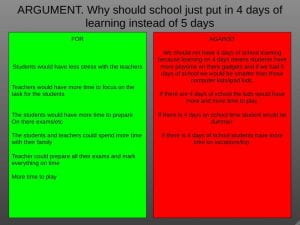 Kia Ora we have been learning how to make an argument. For example one side says For and Against the argument is why should school be 4 days a week instead of 5. I was doing for so I had to write about why I think school should be 4 days a week for an example I think school should be 4 days a week because teachers and students would have less stress at school because they would have more time at home to finish their work and still have time to hang out with your friends or family.